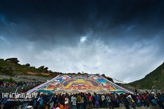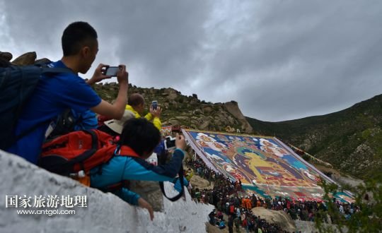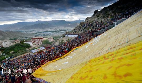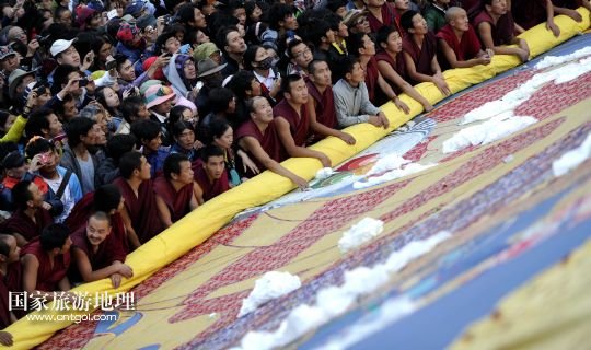 國家旅游地理 西藏拉薩8月6日訊 8月6日,拉薩哲蚌寺舉行展佛儀式。當(dāng)日,以西藏最大的格魯派寺廟哲蚌寺展佛為開端的雪頓節(jié)在拉薩拉開序幕。每年藏歷六月底七月初是西藏傳統(tǒng)的節(jié)日“雪頓節(jié)”。在藏語中,“雪”是酸奶子的意思,“頓”是“吃”“宴”的意思,“雪頓節(jié)”按藏語解釋就是吃酸奶子的節(jié)日,因此又叫“酸奶節(jié)”。因為“雪頓節(jié)”期間有隆重?zé)崃业牟貞蜓莩龊鸵?guī)模盛大的曬佛儀式,所以有人也稱之為“藏戲節(jié)”“曬佛節(jié)”。 /新華社記者 普布扎西攝