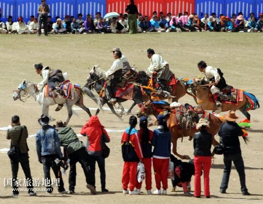 國(guó)家旅游地理 西藏那曲8月10日訊 8月10日,藏族牧民在進(jìn)行跑馬比賽。當(dāng)日,一年一度的藏北“恰青”賽馬藝術(shù)旅游節(jié)開(kāi)幕,牧民們相聚那曲賽馬場(chǎng),載歌載舞慶祝豐收。 /新華社記者唐召明攝