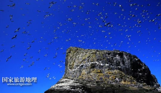 登上圣基爾達(dá)島并非易事,記者因風(fēng)高浪大在外赫布里底群島等待多日才有船出海。僅可乘載10余人的小船在風(fēng)浪中穿行了近3個小時,圣基爾達(dá)島終于出現(xiàn)在霧色籠罩的海面上。島上散落著十余座已經(jīng)荒蕪破敗的石舍和幾百個儲物石室,這些殘存的遺跡早已成為野羊與海鳥的巢穴,人類反而成為外來的訪客。人類文明的消失為一些稀有的物種和瀕臨滅絕的鳥類提供了安全的棲息地。島上陡峭的山坡隨處可見野羊悠然漫步,而那些嶙峋的峭壁和海礁則棲息著數(shù)十萬只各類海鳥。世界上最大的塘鵝群——約6萬對塘鵝在這座海島及附近的海礁上繁衍生息。