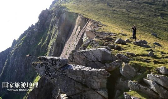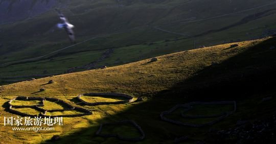 國家旅游地理 英國倫敦8月14日訊 在圣基爾達(dá)島已經(jīng)遺棄的村落旁的山坡上,有用石頭圍墻圈起的一塊塊耕地。當(dāng)年在島上定居的村民在這些石圈內(nèi)鋪墊海藻,種植少量谷物。一個個形狀各異的石圈保護(hù)著這些寶貴的谷物免遭風(fēng)暴與家畜的侵害(7月19日攝)。