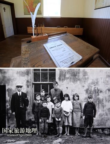 上圖,圣基爾達(dá)島上只有一個教室,一排課桌的小學(xué)校內(nèi)景(7月19日攝)。學(xué)校后來經(jīng)過重新整修。下圖,當(dāng)年島上學(xué)校師生的合影(資料照片,蘇格蘭國家信托基金會提供)。