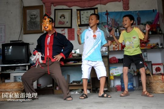 國家旅游地理 廣西河池8月19日訊 8月18日,譚圣慈老人(左一)帶著前來學(xué)習(xí)的兩名男孩跳儺面舞。在廣西北部與貴州交界一帶的我國唯一的毛南族自治縣——環(huán)江毛南族自治縣,神秘的儺戲被譽為毛南族的“族寶”。原始古樸、風(fēng)格獨特的儺戲是毛南族的民間傳統(tǒng)舞蹈,藝人在表演過程中經(jīng)常戴著被稱為儺面的木制面具。儺面一般高30厘米、寬20厘米,由毛南族藝人在民族口頭文學(xué)的基礎(chǔ)上依據(jù)個人想象創(chuàng)作,用優(yōu)質(zhì)木塊雕琢而成,共有文、武、善、兇四大類72種面相。