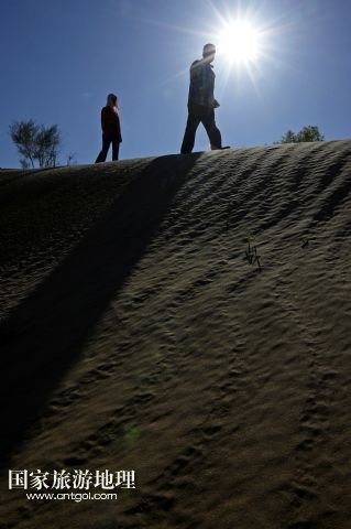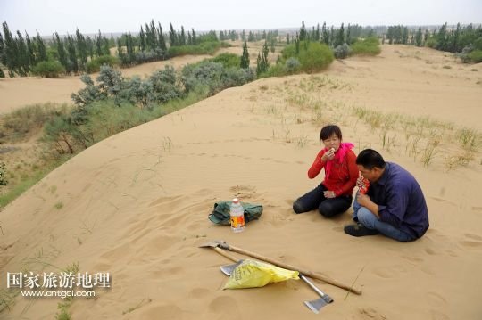 杜生龍、顧蕓香在沙丘上吃午餐(2011年6月17日攝)。