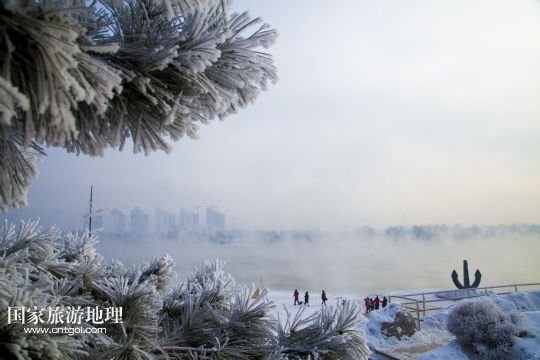 當(dāng)日是冬至,吉林市氣溫降至零下二十?dāng)z氏度,松花江岸邊形成的霧凇景觀(guān)吸引了眾多游客。