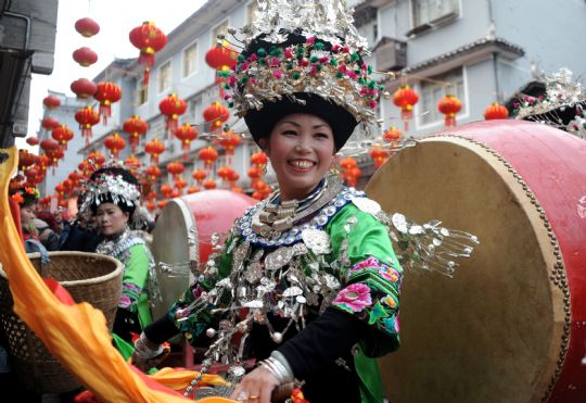 國(guó)家旅游地理 湖南湘西2月15日訊 2月14日,湖南鳳凰苗族婦女打起苗鼓。當(dāng)日是農(nóng)歷元宵節(jié),在湖南鳳凰古鎮(zhèn),當(dāng)?shù)鼐用衽c游客歡聚一堂,共同參與各種民俗文化表演活動(dòng),慶祝節(jié)日。 /新華社記者 范軍威 攝