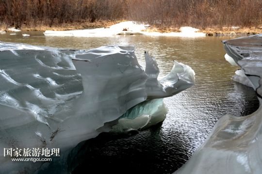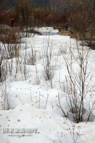 內蒙古阿爾山市白狼林區(qū)陸續(xù)消融的河谷冰雪(5月14日攝)。