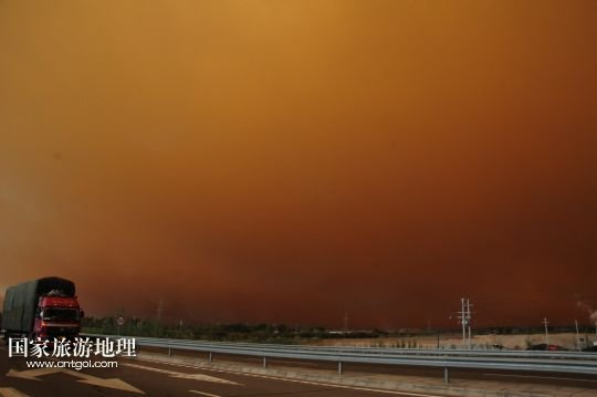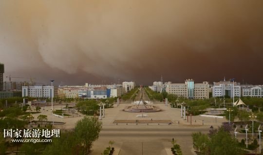 國家旅游地理 甘肅玉門5月23日訊 5月23日,在甘肅玉門市,突如其來的沙塵籠罩了整個城市。當日上午,受新疆低槽冷空氣的影響,甘肅玉門境內(nèi)天空出現(xiàn)罕見的云層奇景和沙塵天氣,原本非常晴朗的藍天,霎時天昏地暗,同時伴有6至7級西風,能見度只有500米。新華社發(fā)(楊旭升 宋常青 攝)