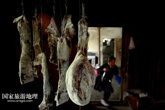 一戶板寮村農家的屋中掛著當地的傳統(tǒng)食品——臘肉(5月22日攝)。