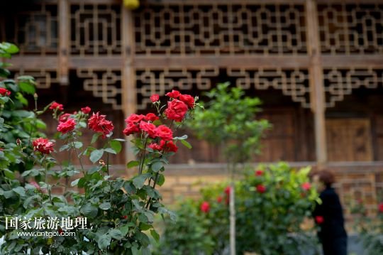 5月23日,板寮村村民在打理吊腳樓前的玫瑰。