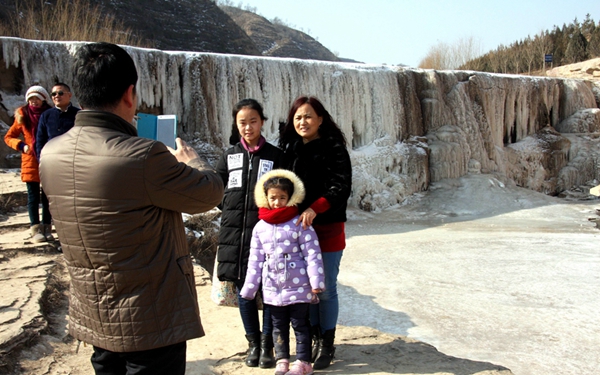 在冰瀑前留影