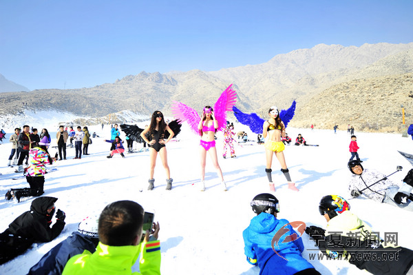 2016年1月1日,新年第一天,在銀川蘇峪口國家森林公園滑雪場,幾位身著色彩艷麗比基尼美女在雪中秀身材并展示瑜伽技巧,吸引了眾多滑雪愛好者的目光。當(dāng)日,蘇峪口滑雪場前來滑雪的人達(dá)數(shù)千人。 寧夏新聞網(wǎng)記者 祁瀛濤 攝