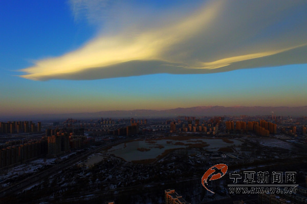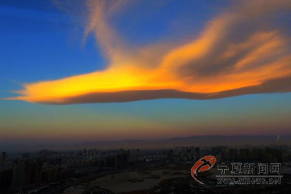 12月26日8時(shí)10分許,銀川上空出現(xiàn)奇云,宛如一只展翅飛翔的鳳凰浮于銀川西邊天空,伴著初升的朝陽(yáng)與巍峨的賀蘭山為伴,格外美麗。 寧夏新聞網(wǎng)記者 祁瀛濤 攝